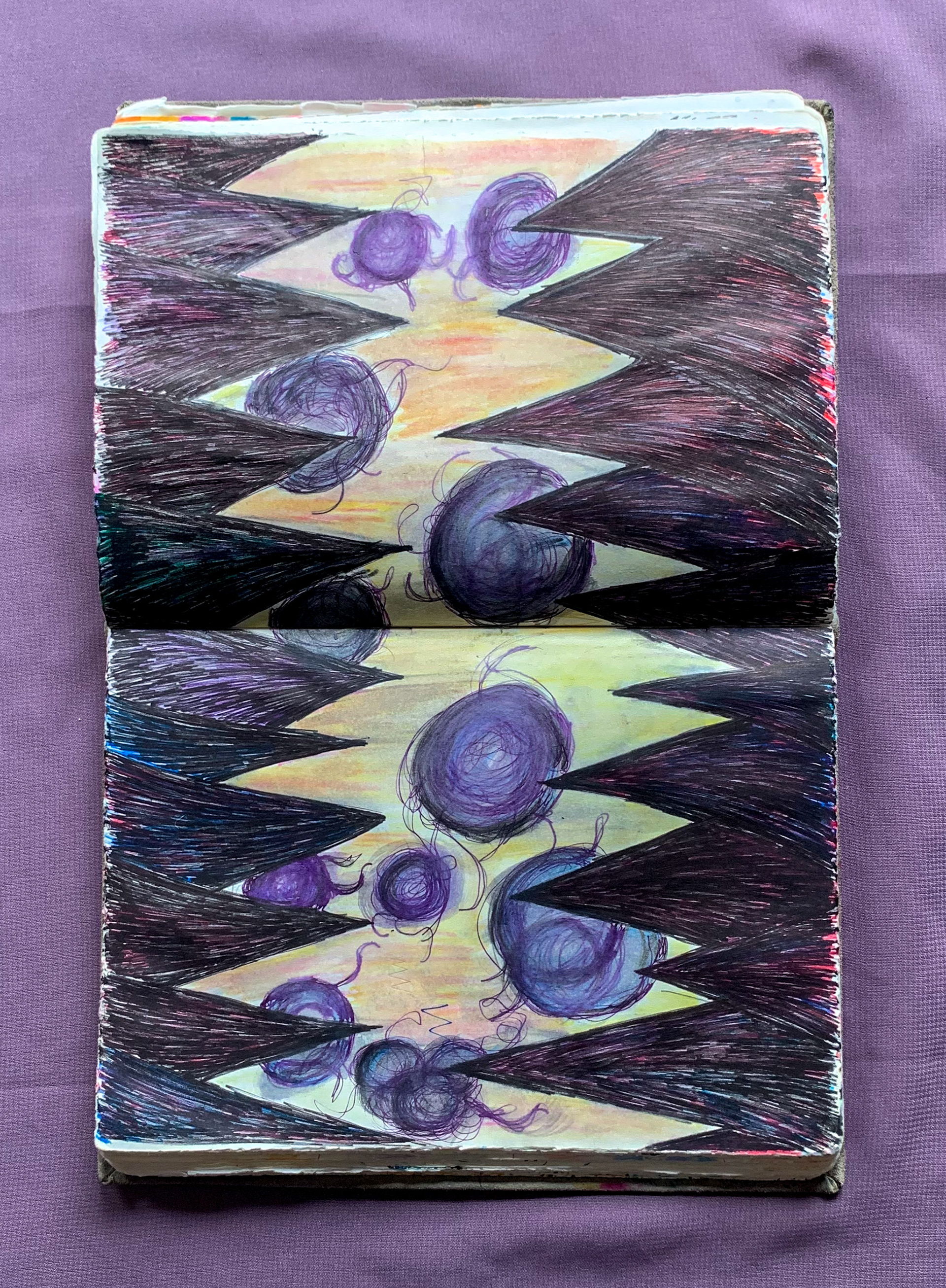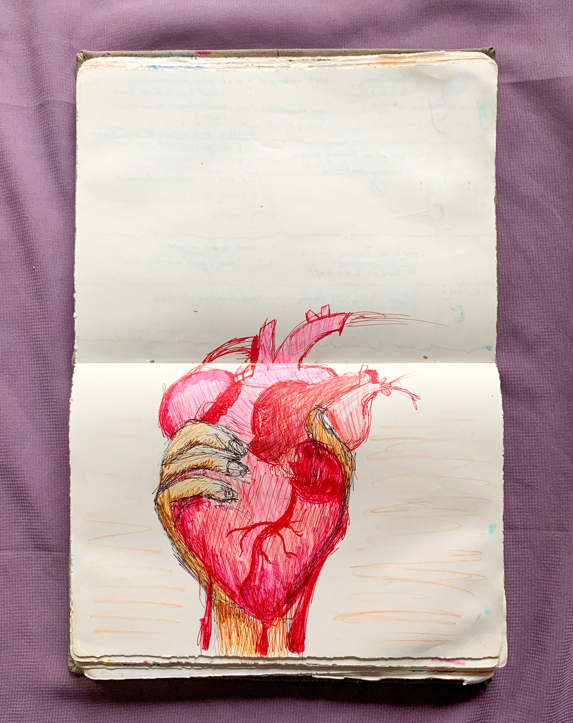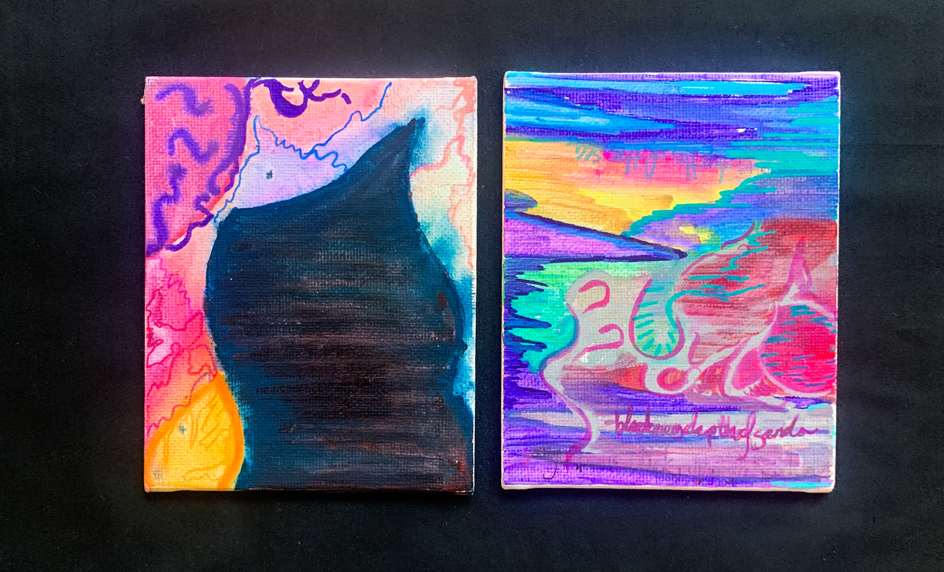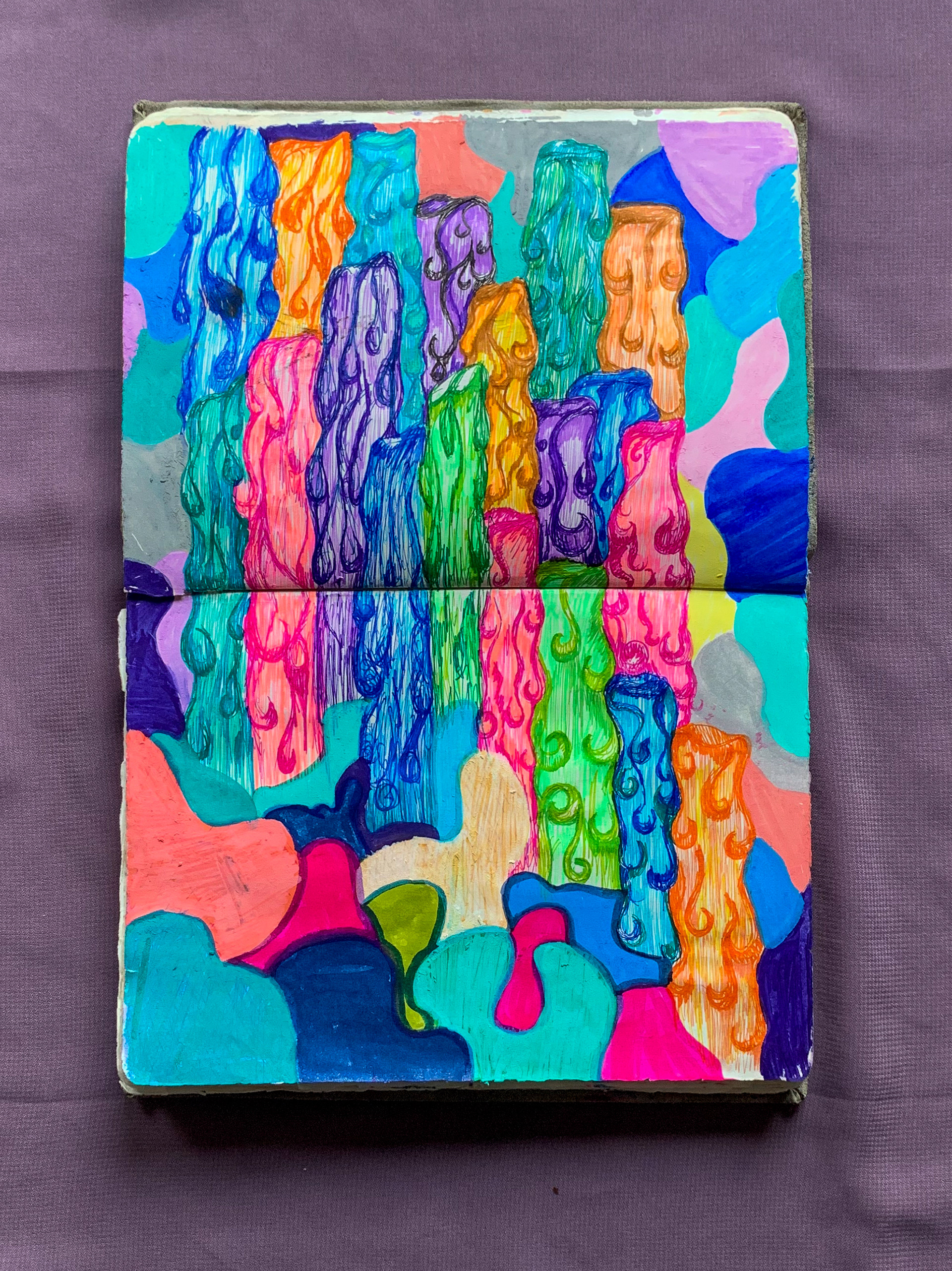 I work with acrylic and watercolor on canvas or paper. I play with contrast through shapes, color, and texture. I carry a journal and set of travel pens and watercolor set. When I feel inspired, I like to whip out a quick doodle.