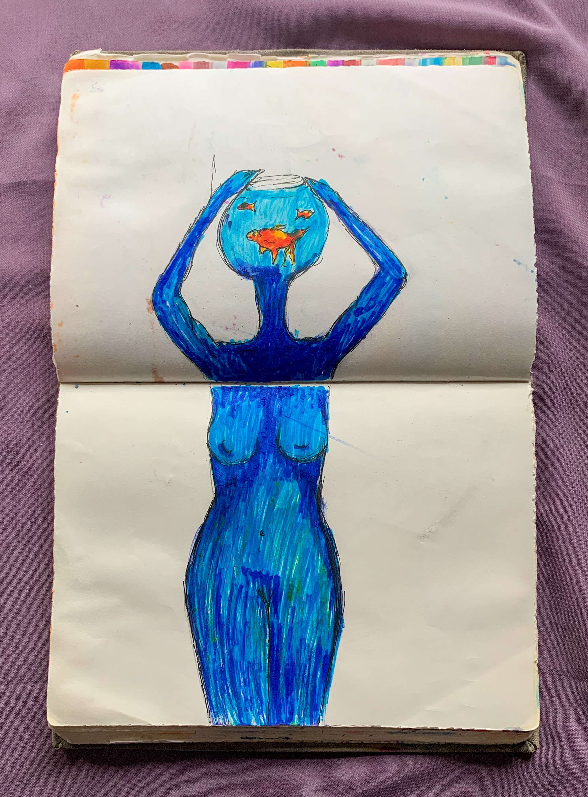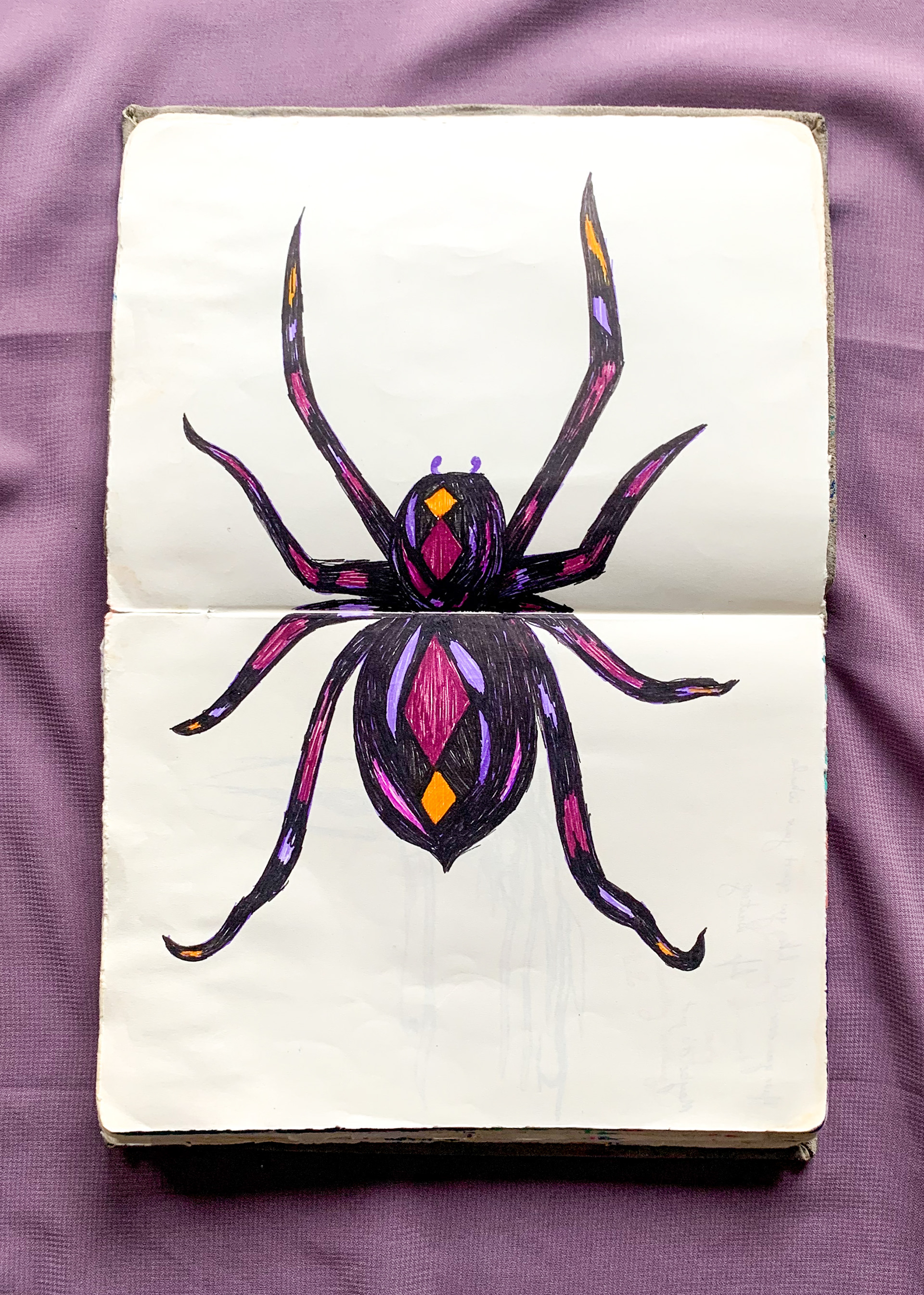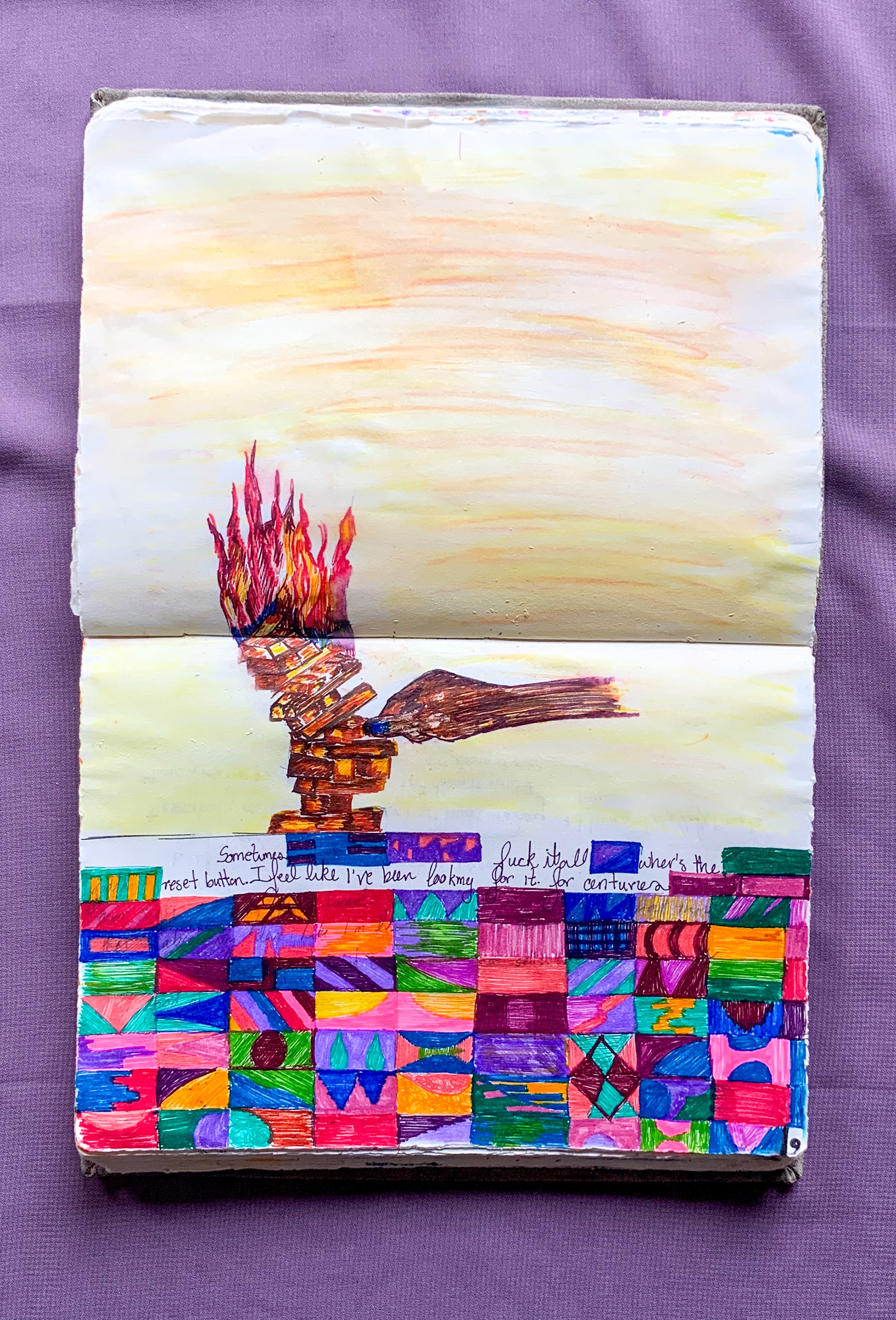 I work with acrylic and watercolor on canvas or paper. I play with contrast through shapes, color, and texture. I carry a journal and set of travel pens and watercolor set. When I feel inspired, I like to whip out a quick doodle.