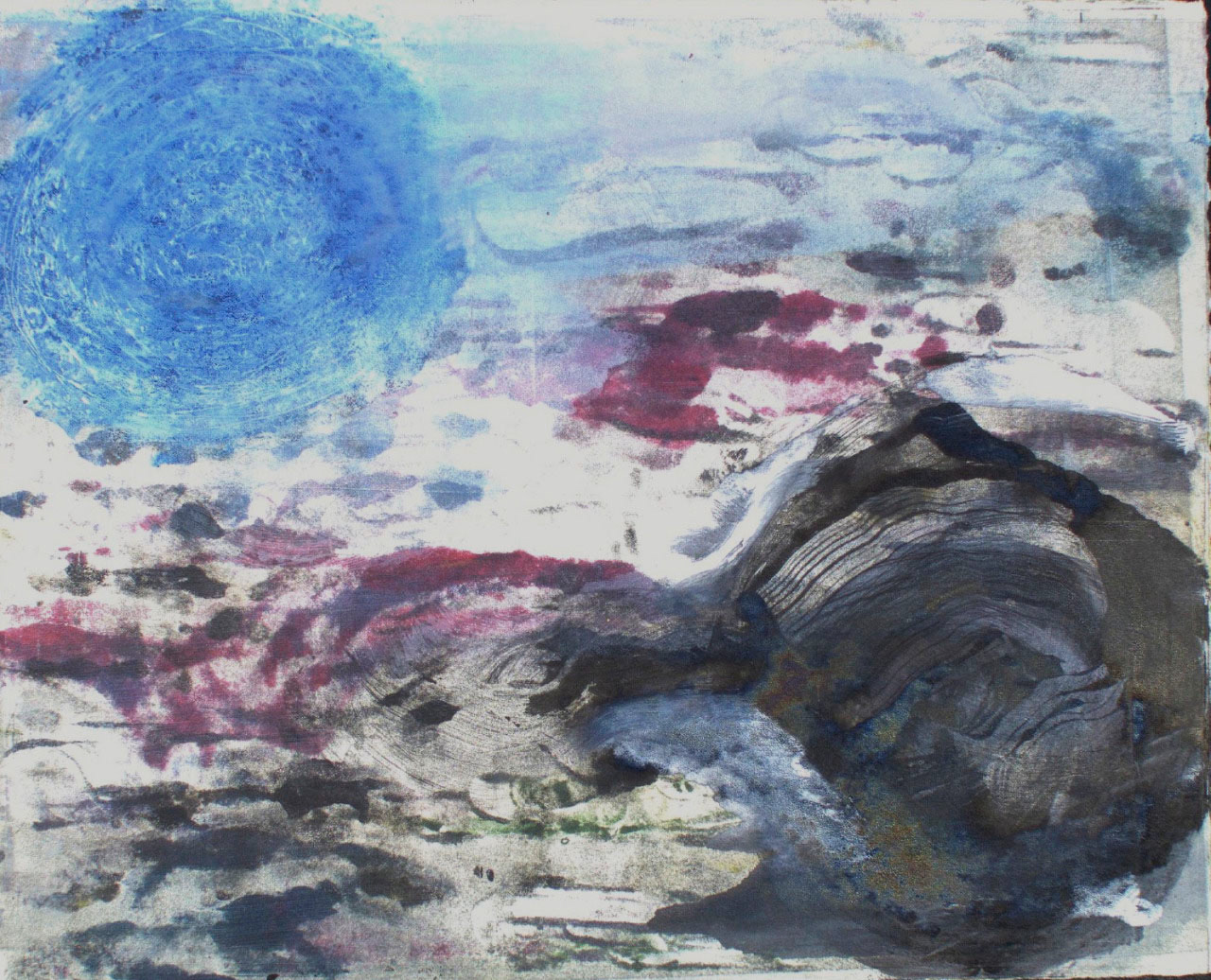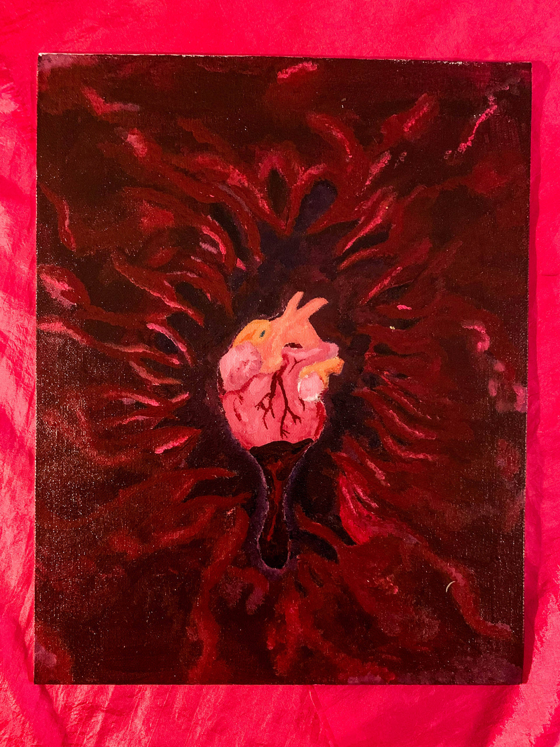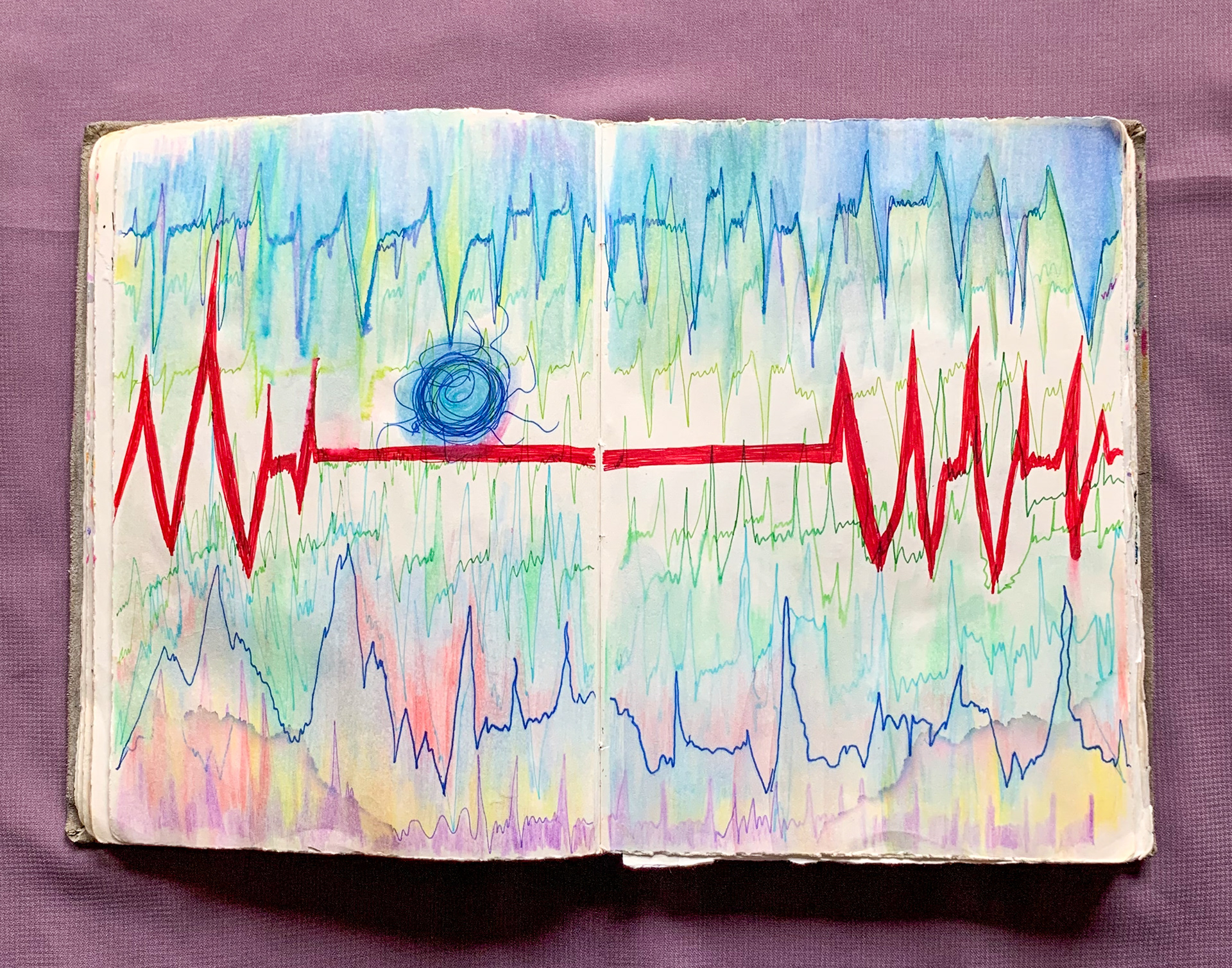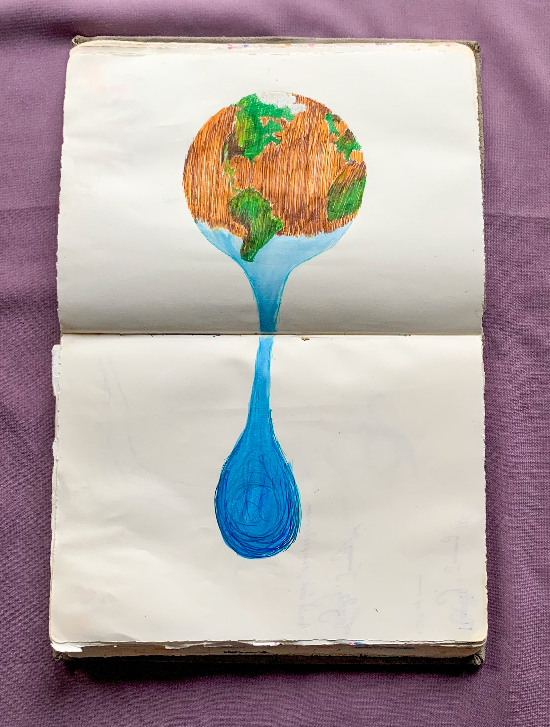 I work with acrylic and watercolor on canvas or paper. I play with contrast through shapes, color, and texture. I carry a journal and set of travel pens and watercolor set. When I feel inspired, I like to whip out a quick doodle.